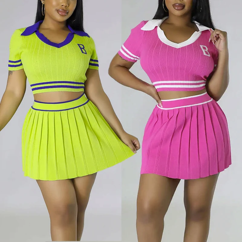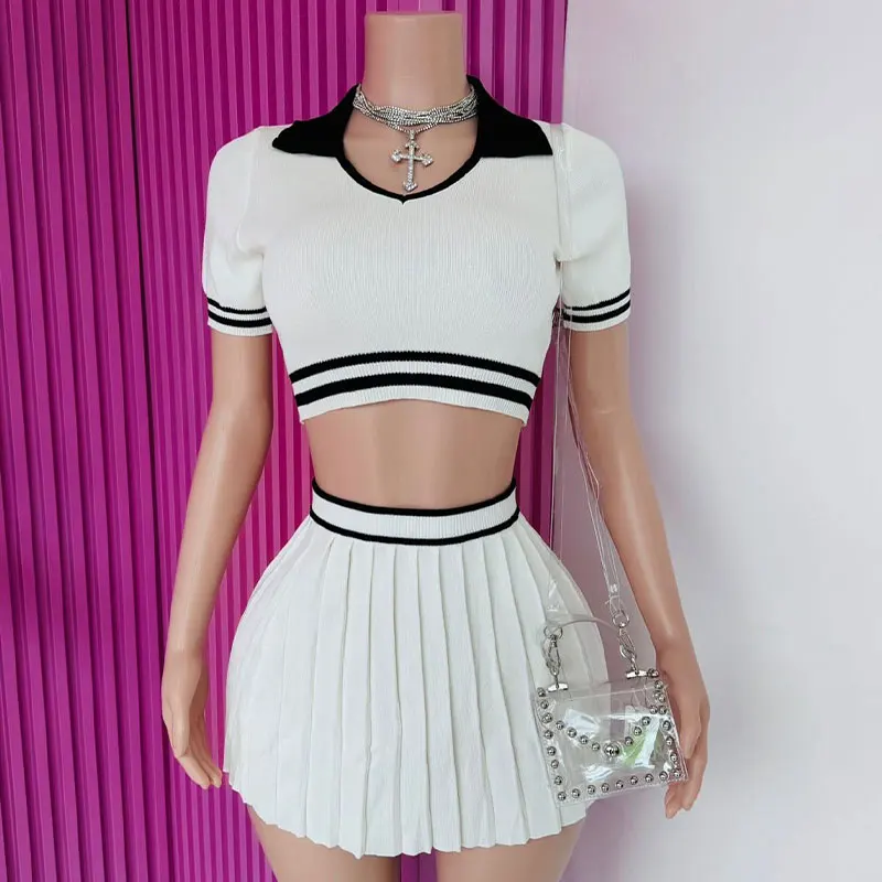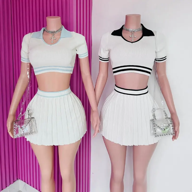 Huili Manufacturers Custom Women Two Piece Polo Crop Top Baddie Pleated Skirt Sports Dress Outfits Knitting Tennis Skirt Set
